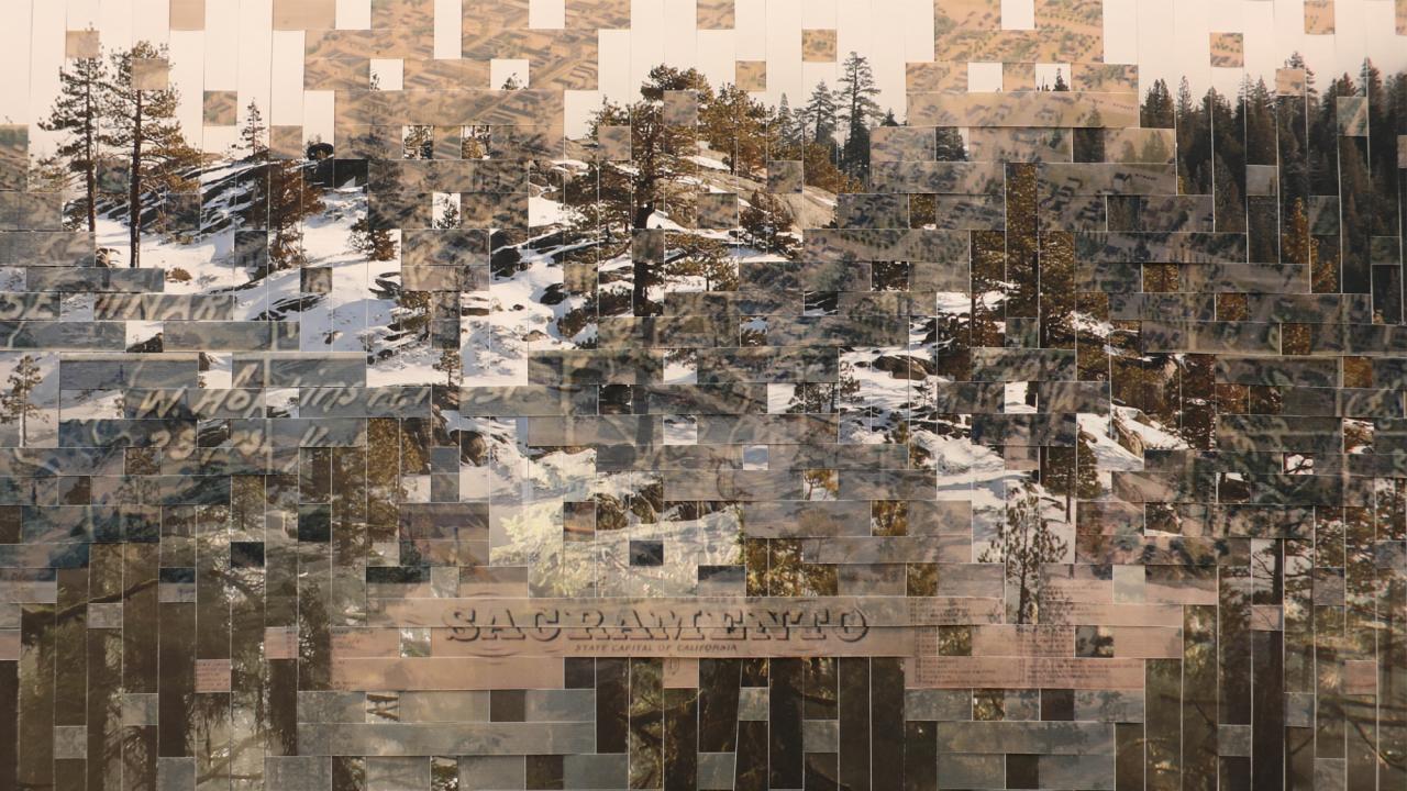 In recent projects, Sense combines contemporary photographs of her tribes’ ancestral home land with landscape scenes of her current California home location and colonial maps and manuscripts. In creating the weavings with these diverse elements, she says her “process of weaving together past, present, and future broadens the visual experience to something that is felt and not seen.”