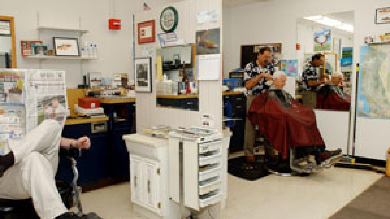 Barber John Salido, puts the finishing snips on a 30-year customer, Emanuel Epstein, emeritus professor of Land, Air and Water Resources, at the University Haircutters barber shop. Tucked away in the Freeborn Hall basement, the two-chair campus shop has been available to students, staff and faculty for more than 60 years and comes complete with a putting green to help pass the time. Salido has been a familiar face to generations of students, running the business since 1970. When he first began, a haircut ran $1.75. The price is not the only thing that has changed over the years. The shop was originally located in North Hall and directed by ASUCD. It even contained a beauty parlor for 10 years. These days the facility is overseen by MU services and only provides haircuts. Although University Haircutters hasn't moved since 1961, Salido says many people still don't know about it. "We're one of the best-kept secrets on campus." -- Mike Sintetos
