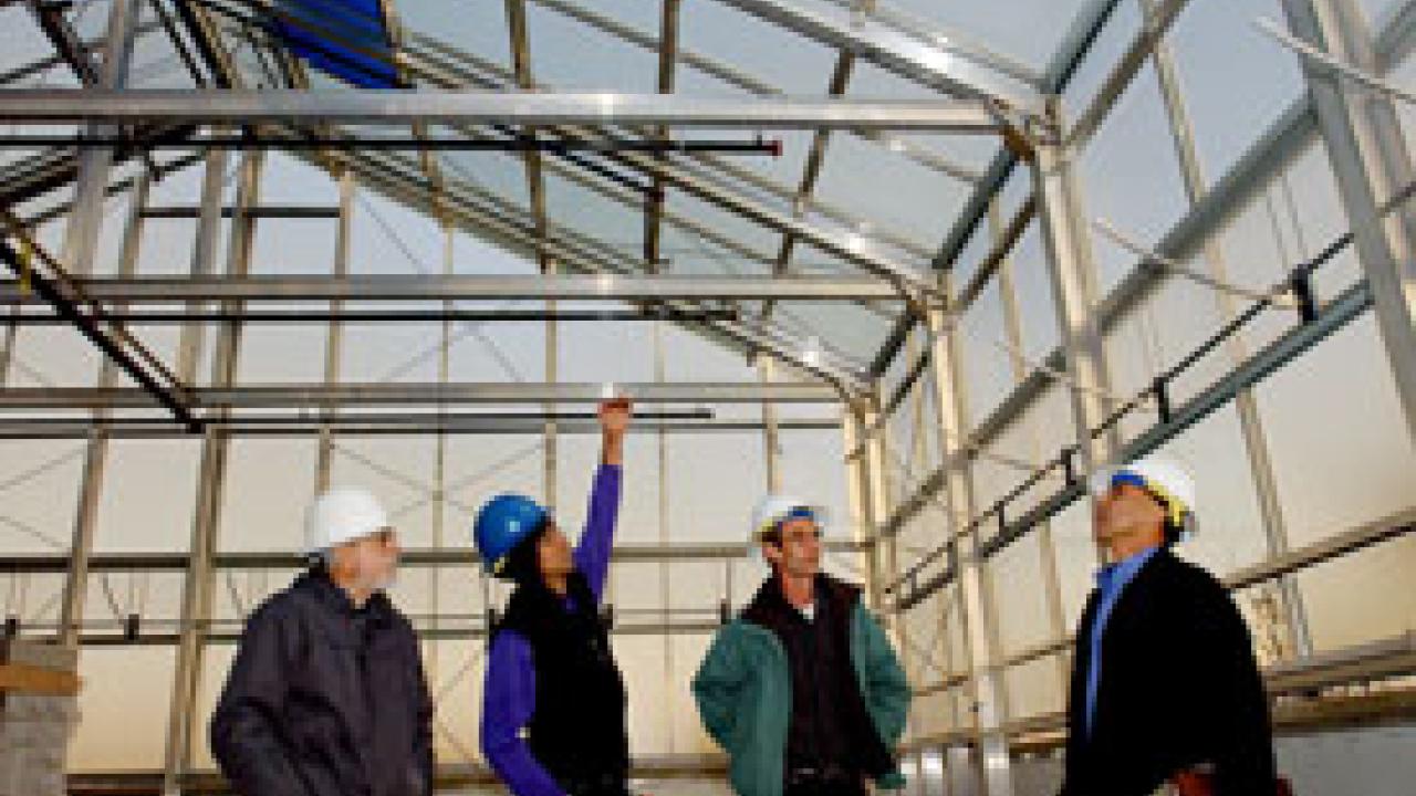 Grady Webster, professor emeritus of plant biology, Botanical Conservatory curators Ernesto Sandoval and Tim Metcalf, and Associate Director of Development for Biological Sciences Roberto Avalos take in the teaching greenhouse in the new Sciences Laboratory Building on Hutchison Drive. The 140,000-square-foot building, due to open in early 2005, will bring all lab instruction in the Division of Biological Sciences under one roof. It will house teaching laboratories for classes in biological sciences and chemistry, areas for private and small-group study, computer labs, and new space for the UC Davis Herbarium.