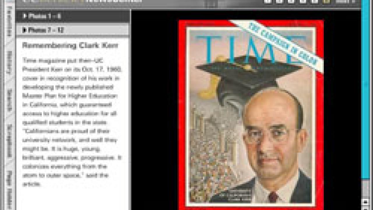 UC Berkeley has created a multimedia Web site and slide show honoring the life of former UC president and Berkeley chancellor Clark Kerr, who died Dec. 1. "Simply put, I have not met, nor do I know about, anyone who has been as prescient, as wise, as courageous, as was Clark Kerr in matters of higher education," said Chancellor Larry Vanderhoef last week after Kerr's death was announced. "I always felt, as well, that he had a special place in his heart for UC Davis. For all of this, I, and thousands of others, will be forever grateful." To view the memorial slide show, see the link at http://www.berkeley.edu/news/. A memorial for Kerr is being planned for early January.