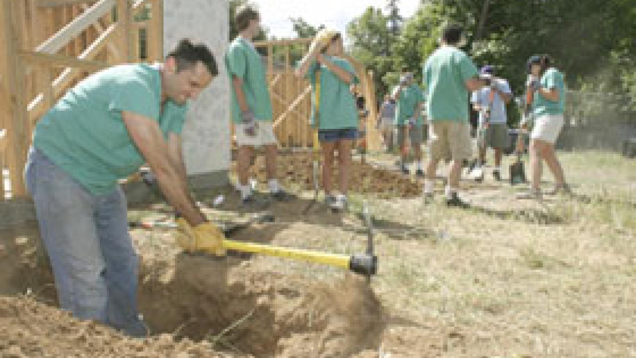 Second-year UC Davis medical student Nathan Osborn trades in his stethoscope to wield a pick Saturday as he digs a trench for utility lines at a Habitat for Humanity project site in Oak Park. Students and other volunteers from the medical center worked construction projects for two Oak Park homes. "It exposed the students to a broader definition of health care," said Amerish Bera, clinical professor of medicine, who spearheaded the inaugural community-service effort. That definition takes the whole patient -- including income level and housing circumstances -- into account, Bera said. The event also was designed to bring students from different years together. The students have said they hope to continue collaborating on a regular basis with Habitat for Humanity, Bera said.