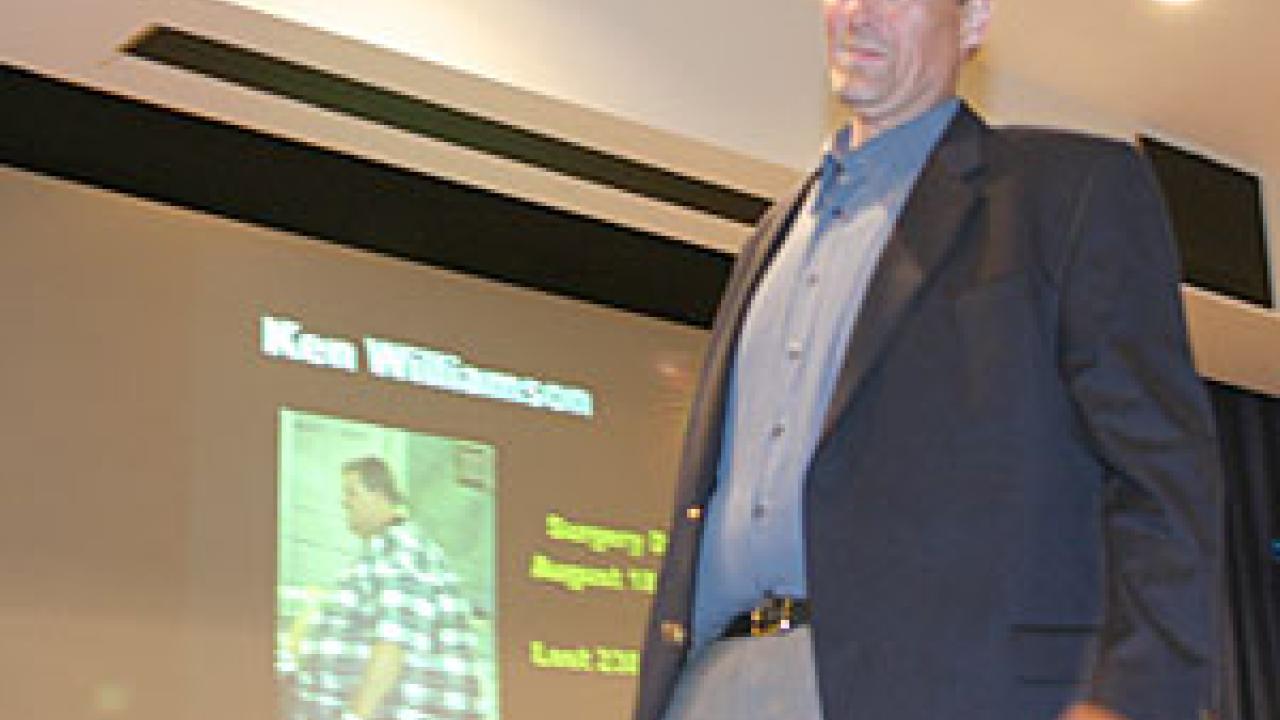 A smiling Ken Williamson, who has lost almost 250 pounds since early 2003, walks down the runway at the medical center's third annual Bariatric Fashion Show, held Aug. 5. About a dozen former patients — who have lost a combined 1,742 pounds — beamed as they strode in front of "before" images of themselves. Mohamed Ali, who has guided the bariatric program since 2002, says: "Our strength is that we've combined a top-flight surgical team with a complete wellness program." That strength was recognized last month as the program was designated a Blue Cross of California "Center of Expertise." During the past three years, Ali has performed nearly 500 gastric bypass operations, where the size of a patient's upper stomach is reduced so less food can be eaten and absorbed. The American Society for Bariatric Surgery estimates that bariatric procedures have increased from about 16,000 in the early 1990s to more than 103,000 in 2003. "This is an operation that literally helps give a person a new lease on life," says Ali. Williamson agrees. "I was homebound — sleeping in my recliner. Now I'm enjoying life, just doing things like walking the dog, camping and fishing."